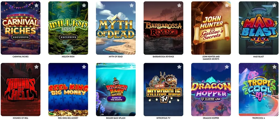 Verkkokasino tekee yhteistyötä yli 60 huippuluokan pelin tarjoajan kanssa, ja pelien kokonaismäärä ylittää 3 500 vaihtoehtoa. Tarjolla on paitsi kolikkopelejä myös live-kasinopelejä sekä pöytäpelejä. Pelaajat voivat itse luoda "Suosikit"-kategorian ja lisätä sinne suosikkipelejään nopeaa pääsyä varten. Tarjolla on myös hakupalkki, jonka avulla voit helposti löytää tietyn pelin tai pelinkehittäjän. Kasinon suosituista pelikategorioista voidaan mainita seuraavat: